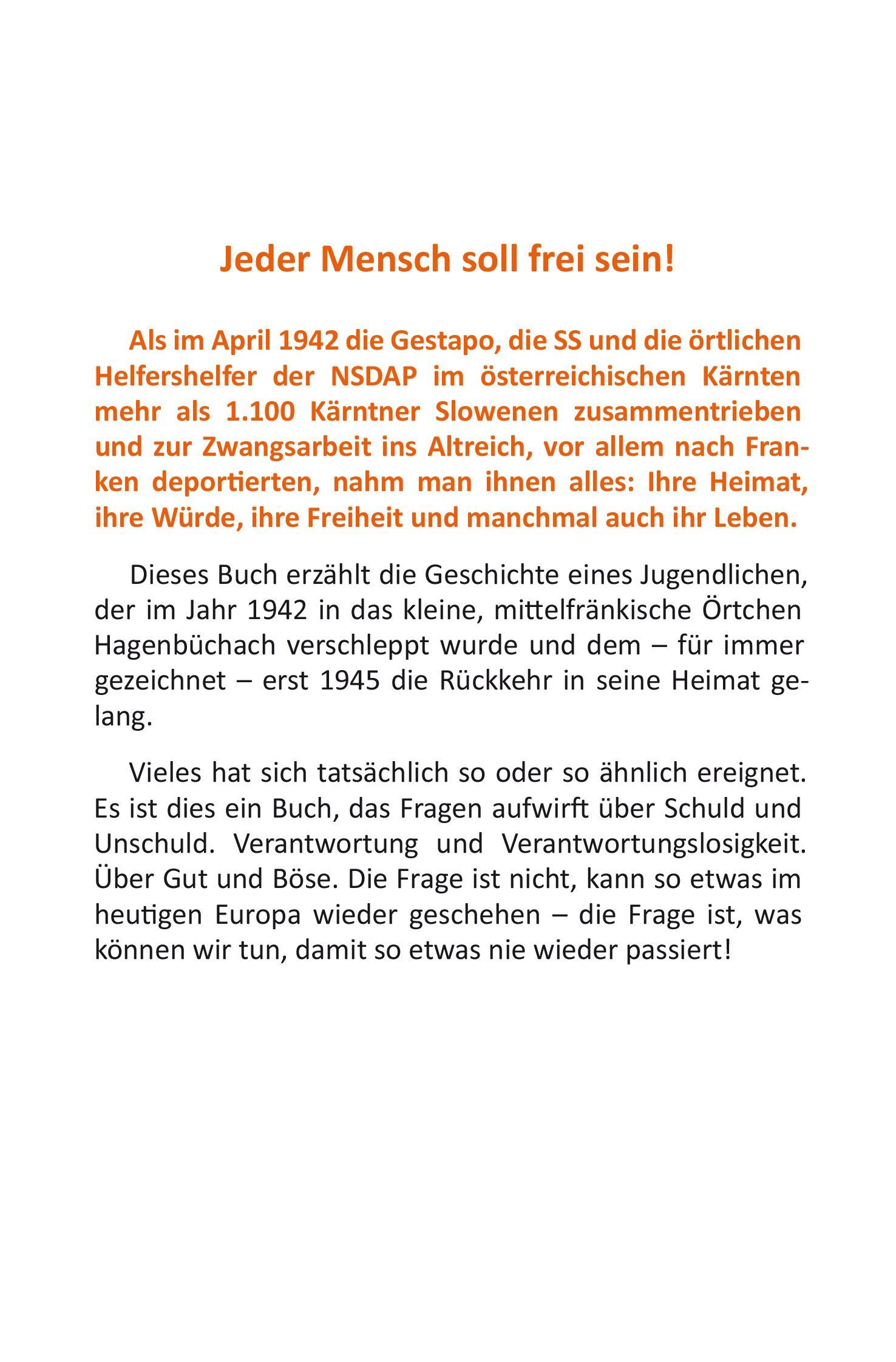 Das sogenannte „Jakoberhaus“ steht in Hagenbüchach im Landkreis Neustadt/Aisch. Hagenbüchach ist eine kleine Gemeinde mit jetzt 1.300 Einwohnern und das Jakoberhaus ein schlossähnliches, stolzes Gebäude. Es passt also eigentlich nicht in ein ländlich geprägtes Örtchen und schon gar nicht in ein bäuerliches Dorf Anfang des 20. Jahrhunderts. Auf der Spurensuche nach den Gründen dieser außergewöhnlichen Standortwahl stieß ich auf die Deportation von circa 100 Kärntner Slowenen, die 1942/43 dort interniert und zum Arbeitsdienst gezwungen wurden. Nicht nur bei hiesigen Historikern, sondern auch bei den Einwohnern Hagenbüchachs erfuhr ich großes Nichtwissen bzw. Nichtwissenwollen – aus den unterschiedlichsten Gründen. Angestachelt vom Schweigen der einheimischen Zeitzeugen machte ich mich auf den Weg nach Kärnten und sprach dort mit fünf Betroffenen, die damals in das Lager Hagenbüchach verbracht wurden. Das Schicksal dieser Menschen und das Leiden, das heute noch zu spüren ist, hat mich derart tief angerührt, dass ich beschloss, das Schicksal der Kärntner Slowenen im deutschen Raum der Öffentlichkeit zugänglich zu machen. Jedenfalls soweit dies in meiner Macht steht. Ich entschied mich für die Romanform, um möglichst viele Leserinnen und Leser zu erreichen, habe jedoch alle historischen Begebenheiten penibel recherchiert und - soweit mir bekannt - auch die bisher einzige Liste erstellt, auf der alle ca. 1.100 Deportierte mit Namen, Vulgonamen, Lager, Herkunftsort etc. zusammengefasst sind. Das Buch befasst sich jedoch nicht nur mit der Deportation von Menschen im 2. Weltkrieg, sondern beschäftigt sich auch mit dem faschistischen Gedankengut und dem Populismus damals wie heute und stellt den Bezug zur aktuellen politischen Situation in Deutschland, Österreich und Europa.